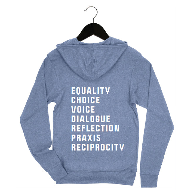 Instructional Coach zip-front hoodie; backside features Jim Knight’s 7 Partnership Principles: Equality, Choice, Voice, Dialogue, Reflection, Praxis, Reciprocity