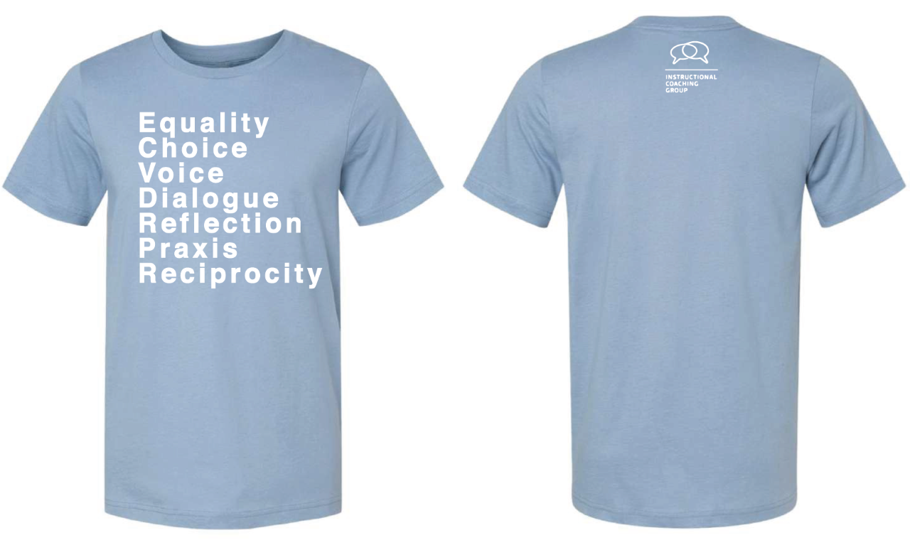 Instructional Coach t-shirt featuring Jim Knight’s 7 Partnership Principles: Equality, Choice, Voice, Dialogue, Reflection, Praxis, Reciprocity